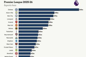 英超球队经纪人费用:切尔西6500万镑领跑,维拉、曼城利物浦前四