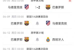 体育资讯04月05日讯 本轮西甲,巴萨2-1逆转马竞。