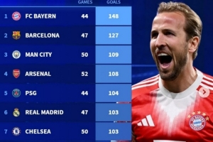 本赛季五大联赛球队总进球榜:拜仁148球断层领跑,巴萨次席