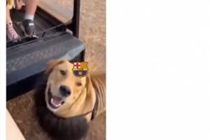其中,一只狮子被加上了巴萨队徽,跑到带着马竞队徽的人身前,被薅下头套,下面是条狗。